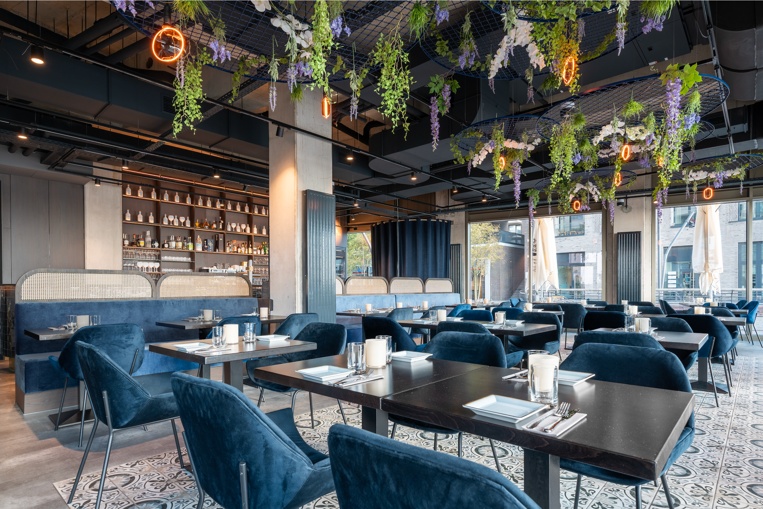 Mediterranes Lebensgefühl trifft auf hanseatischen Flair: In der Hamburger Hafencity, direkt an der Elbpromenade, durften wir eine Tapasbar gestalten, die Genuss und Design auf besondere Weise verbindet. Der lichtdurchflutete Raum mit hohen Decken und Panoramaverglasung öffnet den Blick auf die Elbe und schafft eine luftige Großzügigkeit. Industrielle Elemente wie die offene Decke und Sichtbetonoberflächen verleihen dem Interieur eine urbane Note, die durch warme Holztöne, Wiener Geflecht und edle Samtstoffe harmonisch ausbalanciert wird.