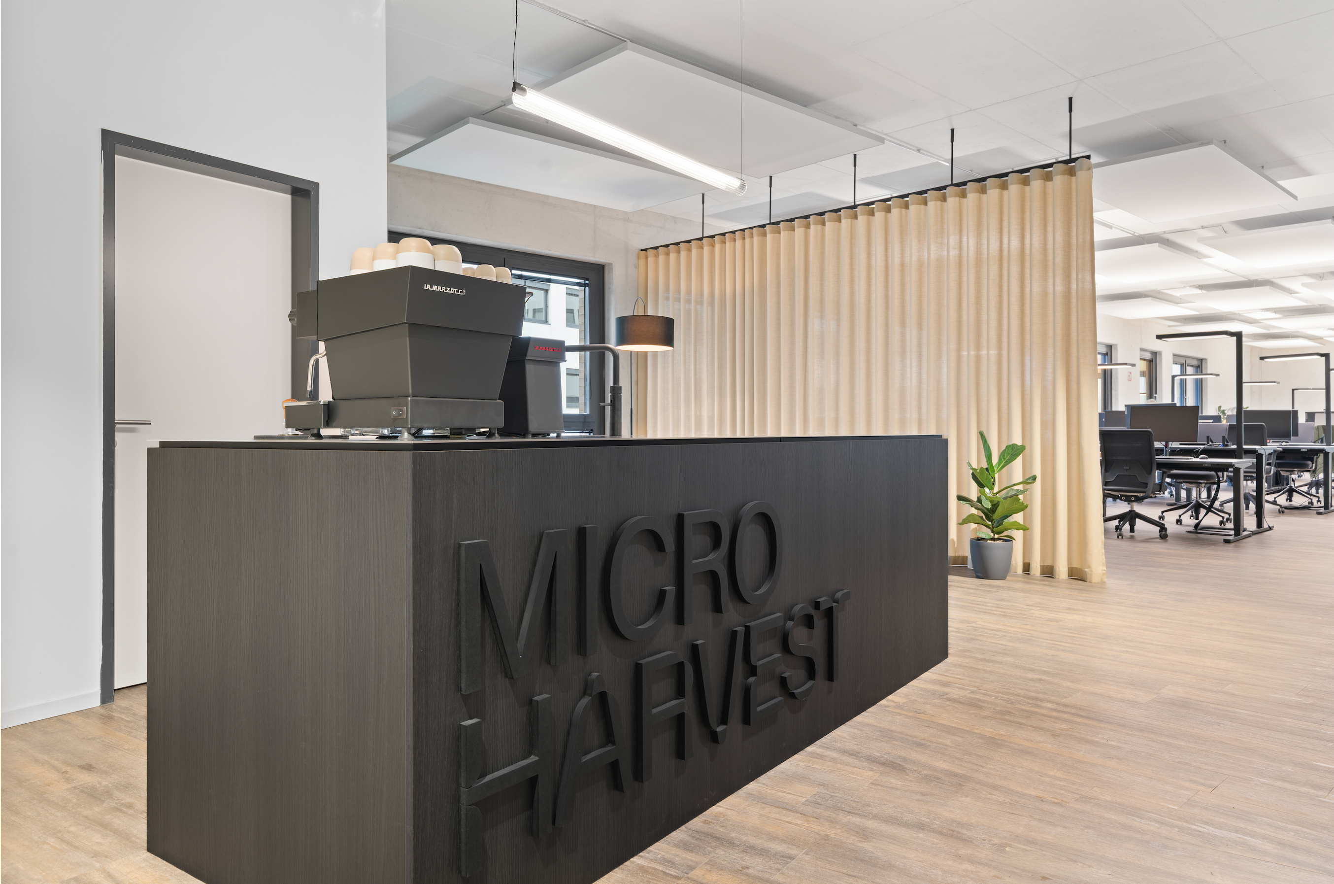 Für MicroHarvest, ein nachhaltiges Biotech-Unternehmen mit Standorten in Hamburg und Lissabon, durften wir ein sehr kompaktes, aber durchdachtes Projekt umsetzen:Einen multifunktionalen Empfangstresen mit integrierter Coffee-Station im Eingangsbereich.Der Tresen ist bewusst funktional und reduziert gehalten – mit Siebträgermaschine, einem in die Tresenplatte integrierten Kaffee-Satz-Durchklopfer sowie einem Waschbecken. Rückseitig befinden sich ein Gastromöbel mit Kühlschubladen und Stauschränke. Die Edelstahlplatte schwebt dank einer kleinen Schattenfuge leicht über dem monolithischen Block des Tresens und verleiht ihm trotz Massivität eine gewisse Leichtigkeit.Der schwarze Schriftzug des Logos hebt sich nur dezent vom ebenfalls dunklen Hintergrund ab – zurückhaltend, aber klar.Ein Vorhang trennt den Bereich sanft von der offenen Bürofläche und unterstützt zugleich die Akustik.Für Licht sorgt eine Leuchte von Wever & Ducré – besonders das Riffelglas, das das Leuchtmittel umhüllt, setzt dabei einen feinen Akzent.Ein schönes Beispiel dafür, wie selbst kleine Eingriffe Atmosphäre, Funktion und Identität eines Ortes prägen können.