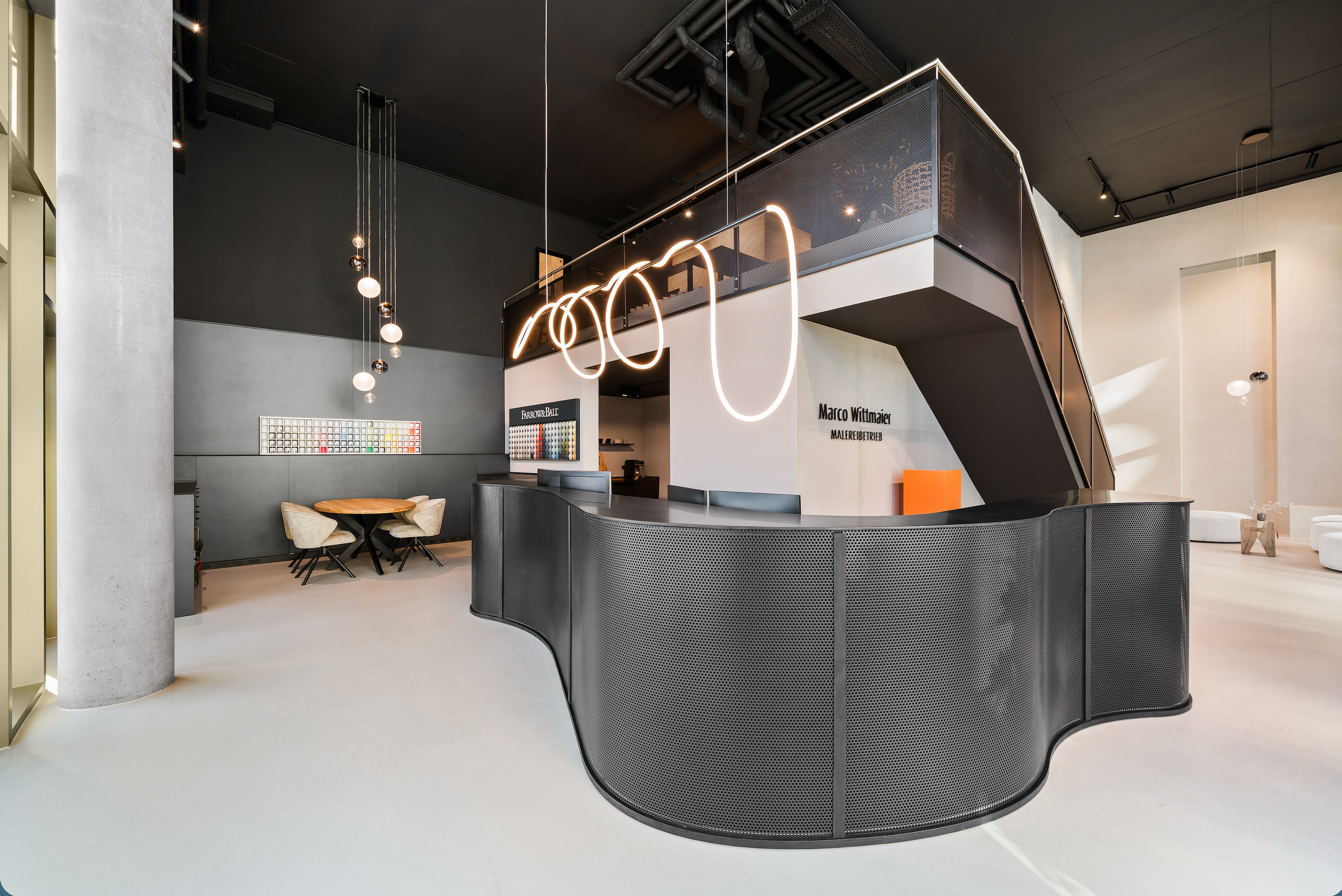 Der Showroom besticht durch einen großzügigen Luftraum und eine klare, industrielle Ästhetik. Offene Deckenstrukturen und das Geländer in Lochblech verleihen dem Raum Charakter und Tiefe.