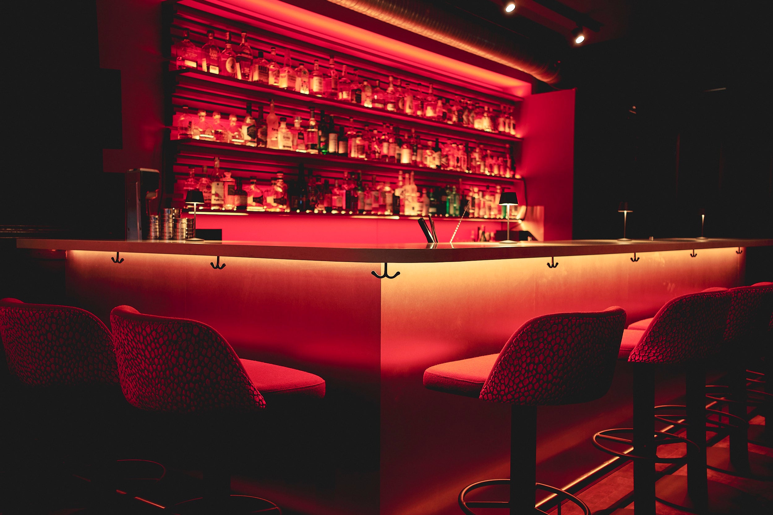 Federführend ist dabei die Farbe Rot – als leuchtender Leitfaden, der den Raum zusammenhält und ihm seine unverwechselbare Identität verleiht. „Warme" Elemente treffen bewusst auf kontrastierende Materialien: Edelstahl, gepulverter Stahl und Mineralwerkstoff setzen kühle, präzise Akzente, während weiche Bezugsstoffe und raumdefinierende Vorhänge eine einladende, intime Note einbringen.Ein zentrales Highlight ist das beleuchtete Barregal, das wie ein eigener Lichtkörper den Mittelpunkt des Raumes inszeniert. Dazu bildet die maßgefertigte Hochsitzbank an der charakteristischen Klinkerwand einen starken Gegenpol. Ihr Rhythmus aus prägnanten LED-Röhren erzeugt eine ikonische Lichtstimmung, die den Raum strukturiert und ihm Tiefe verleiht.
